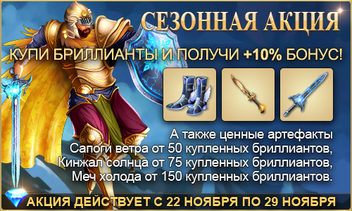 Более того, за суммарную покупку от 50 бриллиантов во время акции вы единоразово получите уникальный артефакт Сапоги ветра.